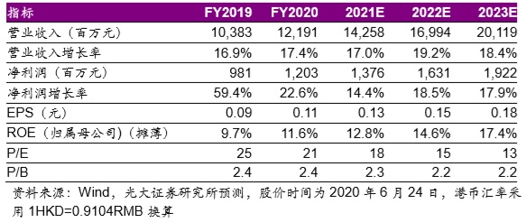 长期来看公司专业羽绒服龙头地位不变,且近年来业务持续革新、经营效率不断提升,核心业务和主品牌保持持续增长、品牌力不断强化、看好其持续增长和龙头份额提升,以及在短期外部环境波动下龙头抗风险能力较强的优势,20年3月末货币资金36.39亿元、具有充足流动性,维持21~22财年EPS、新增23财年EPS为0.13、0.15、0.18元人民币,对应21财年PE18倍,维持“买入”评级。