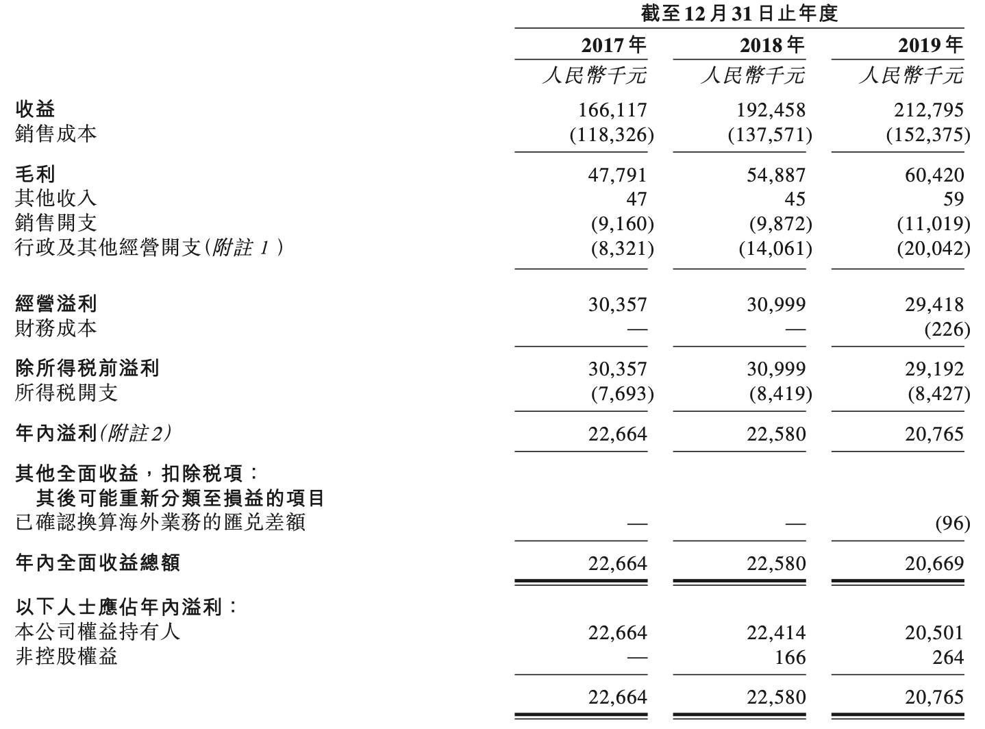 截至12月31日止的2017年、2018年及2019年度,该公司录得收益分别约为1.66亿元(人民币,下同)、1.93亿元及2.13亿元;毛利分别约为4780万元、5490万元及6040万元,毛利率分别约为28.8%、28.5%及28.4%。