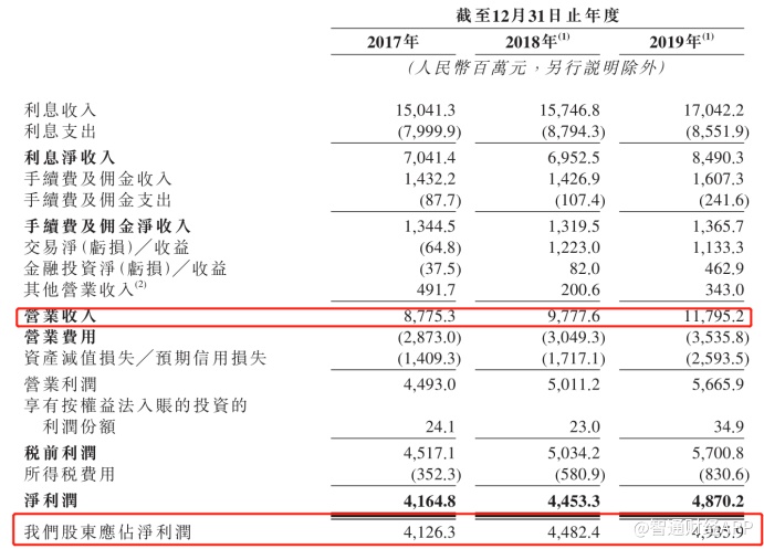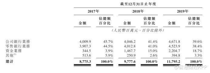 该行收入主要来自公司银行业务及零售银行业务,2017年-2019年,来自公司银行业务收入占总收入的比例分别为45.7%、41.4%以及39.6%。来自零售银行业务收入占总收入的比例分别为44.5%、41.4%以及38.4%。