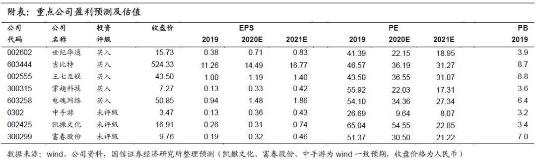 国信传媒观点:1)受益于全民线上办公导致娱乐时长增加,2020年一季度移动游戏行业收入近550亿,同比增长超过49%,二季度增长幅度有所回落,仍保持较高增长;2)与需求旺盛相比,由于公共卫生事件原因大量游戏延期上线,新品游戏供给相对稀缺,本次腾讯游戏年度发布会公布《地下城与勇士》、《龙之谷2》等诸多新游将于暑期上线,游戏行业有望迎来新一轮供给推动的行业景气上行;3)短期腾讯游戏发布会催化之外,中长期来看,在下游渠道变化(参见我们近期字节跳动渗透游戏报告)、游戏出海、新技术(云游戏等)等多重因素驱动之下,游戏行业有望持续保持高景气;叠加相对较低的估值水平和较高的业绩增速,游戏板块具备良好的投资机遇;4)投资标的上,A股持续推荐三七互娱、世纪华通、吉比特、掌趣科技、电魂网络等标的,关注凯撒文化、富春股份;港股及海外推荐腾讯控股、网易(NTES.US)、中手游(00302)、心动网络(02400)等。