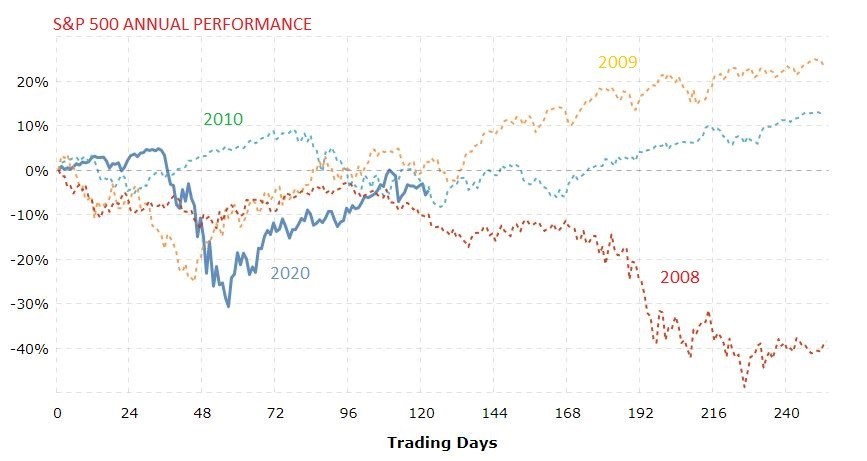 下图是标普500指数2020年与2008年到2010年的表现曲线对比图。在过去的16年里,只有3年与今年相似:陷入灾难般熊市的2008年、自三月触底后进入牛市的2009年以及对复苏乏力和对债务消化不良的担忧的2010年。当然,公共卫生事件的流行轨迹以及消费与商业活动的恢复与调整都将领导着市场的发展方向。