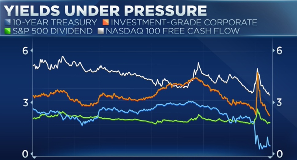 下图为过去五年内,纳斯达克100指数相对于美国国债、高级企业债和标普500指数股息收益率的自由现金流收益率曲线图。它们呈现了相关性。