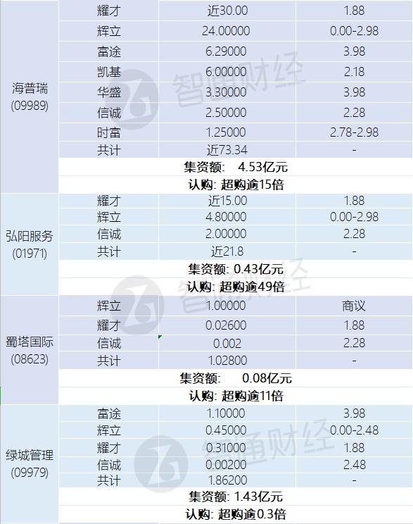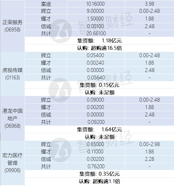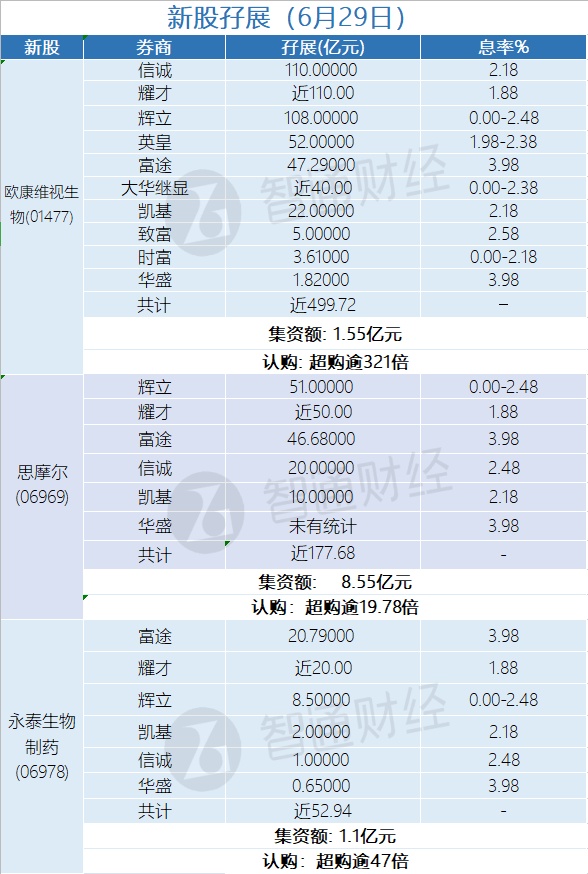 智通财经APP获悉,欧康维视生物-B(01477)、思摩尔(06969)、永泰生物-B(06978)、海普瑞(09989)、弘阳服务(01971)、蜀塔国际(08623)、绿城管理(09979)、正荣服务(06958)、虎视传媒(01163)、港龙中国地产(06968)、宏力医疗管理(09906)正在招股中,截至6月29日,辉立 、耀才、信诚等券商合计分别为其借出近499.72亿港元、近177.68亿港元、近52.94亿港元、近73.34亿港元、近21.8亿港元、1.028亿港元、1.862亿港元、20.661亿港元、0.0564亿港元、0.092亿港元、0.762亿港元。其中,欧康维视-B超购逾321倍、思摩尔超购逾19.78倍、永泰生物-B超购逾47倍。