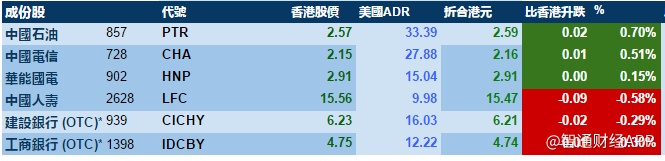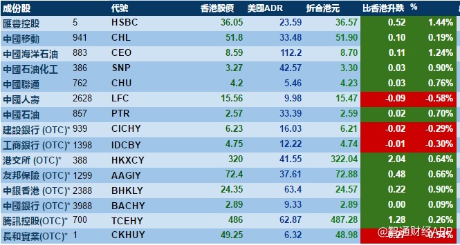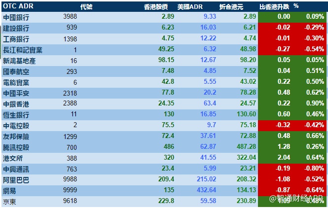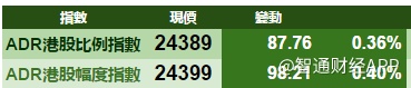 智通财经APP获悉,美股显着反弹,刺激港股ADR指数全日靠稳,按比例计算,收报24,389点,升88点。