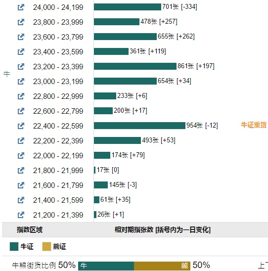智通财经APP获悉,截至6月29日,恒指最新的牛熊街货比例50:50。摩根恒指牛熊证街货分布图中的数据显示,熊证街货重货区在25400-25599区间,该区间最新熊证数量为977张,较上一交易日减少460张,最多新增区间在25200-25399,该区间最新熊证数量为914张,较上一交易日增加275张。牛证街货重货区在22400-22599区间,该区间最新牛证数量为954张,较上一交易日减少12张,最多新增区间在23600-23799区间,该区间最新牛证数量为655张,新增262张。