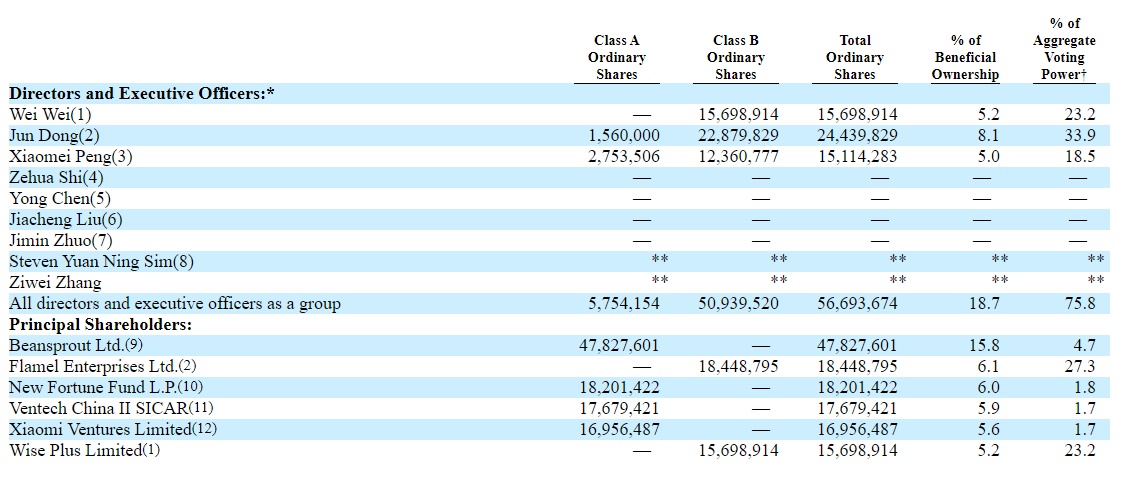 品钛董事兼首席执行官魏伟通过Wise Plus Limited持有品钛股份比例为5.2%,享有23.2%的投票权;