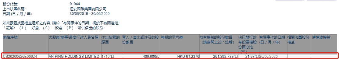 智通财经APP获悉,香港联交所最新资料显示,6月26日,AN PING HOLDINGS LIMITED增持恒安国际(01044)40万股,每股作价61.2376港元,总金额约为2449.5万港元。智通财经APP获悉,增持后最新持股数目为2.61亿股,最新持股比例为21.97%。