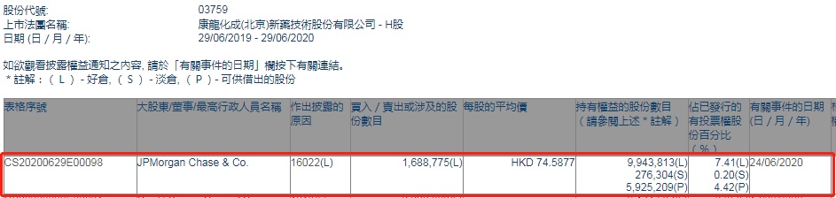智通财经APP获悉,香港联交所最新资料显示,6月24日,摩根大通减持康龙化成(03759)168.8775万股,每股作价74.5877港元,总金额约为1.26亿港元。智通财经APP获悉,减持后最新持股数目为994.38万股,最新持股比例为7.41%。