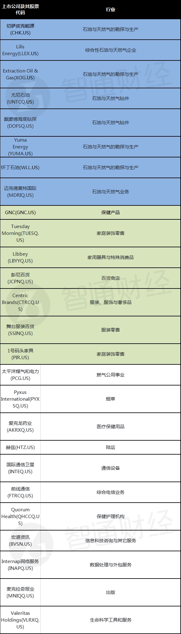 上述公司中,能源类公司有8家,包括最近申请破产的美国页岩油先驱切萨皮克能源(CHK.US);零售类公司有7家。这两个行业的公司数就占了将近总数的一半。