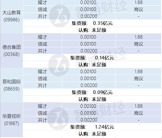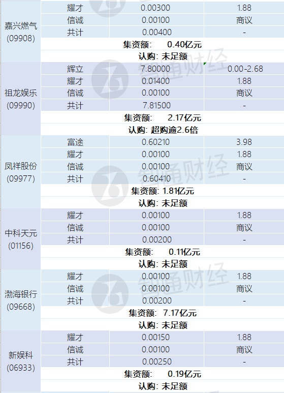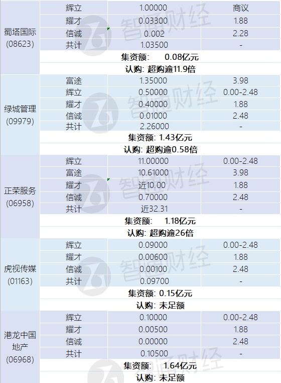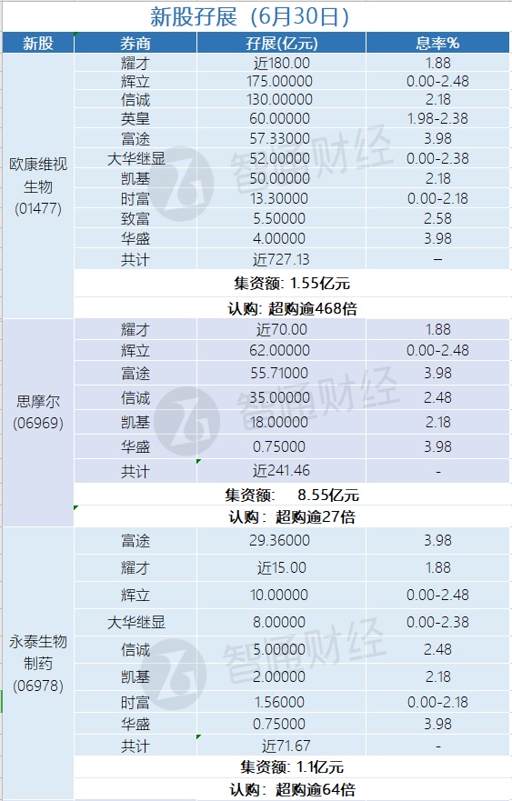 、耀才、信诚等券商合计分别为其借出近727.13亿港元、近241.46亿港元、近71.67亿港元、1.035亿港元、2.26亿港元、近32.31亿港元、0.097亿港元、0.105亿港元、0.004亿港元、7.815亿港元、0.6041亿港元、0.002亿港元、0.002亿港元、0.0025亿港元、0.002亿港元、0.002亿港元、0.002亿港元、0.002亿港元。其中,欧康维视-B超购逾468倍、思摩尔超购逾27倍、永泰生物-B超购逾64倍。