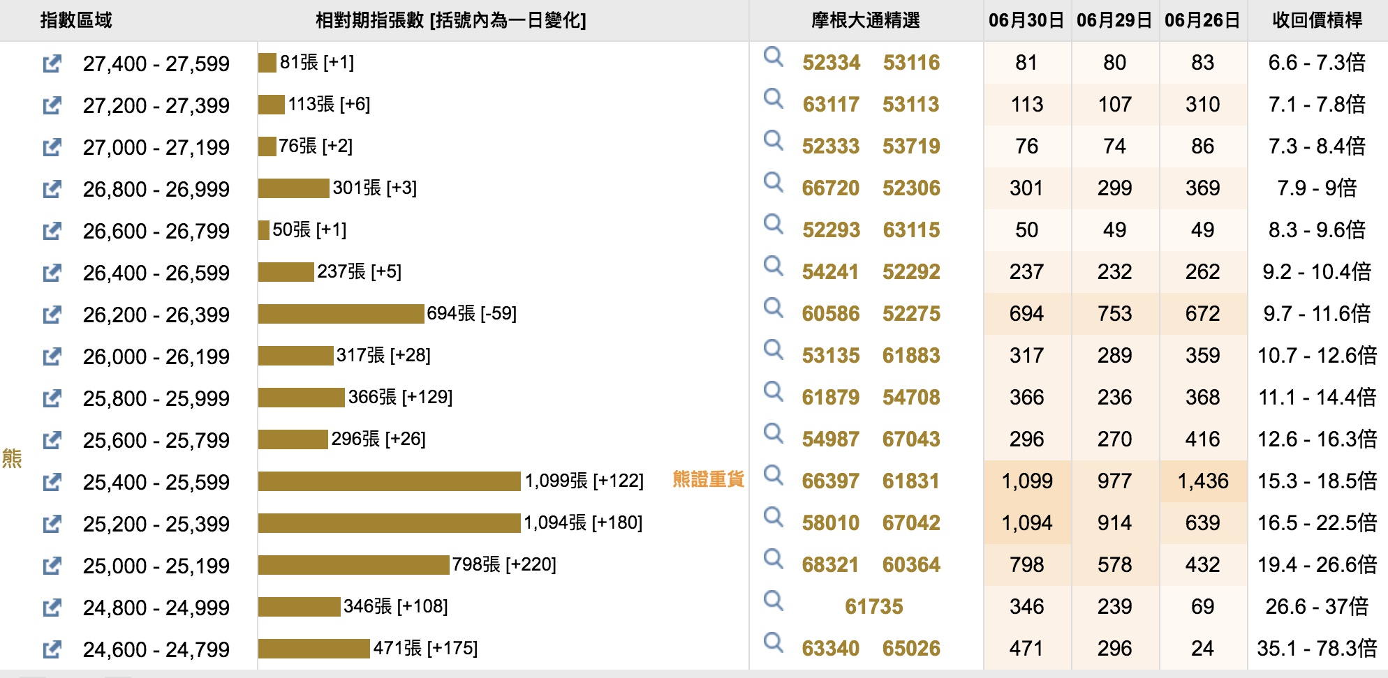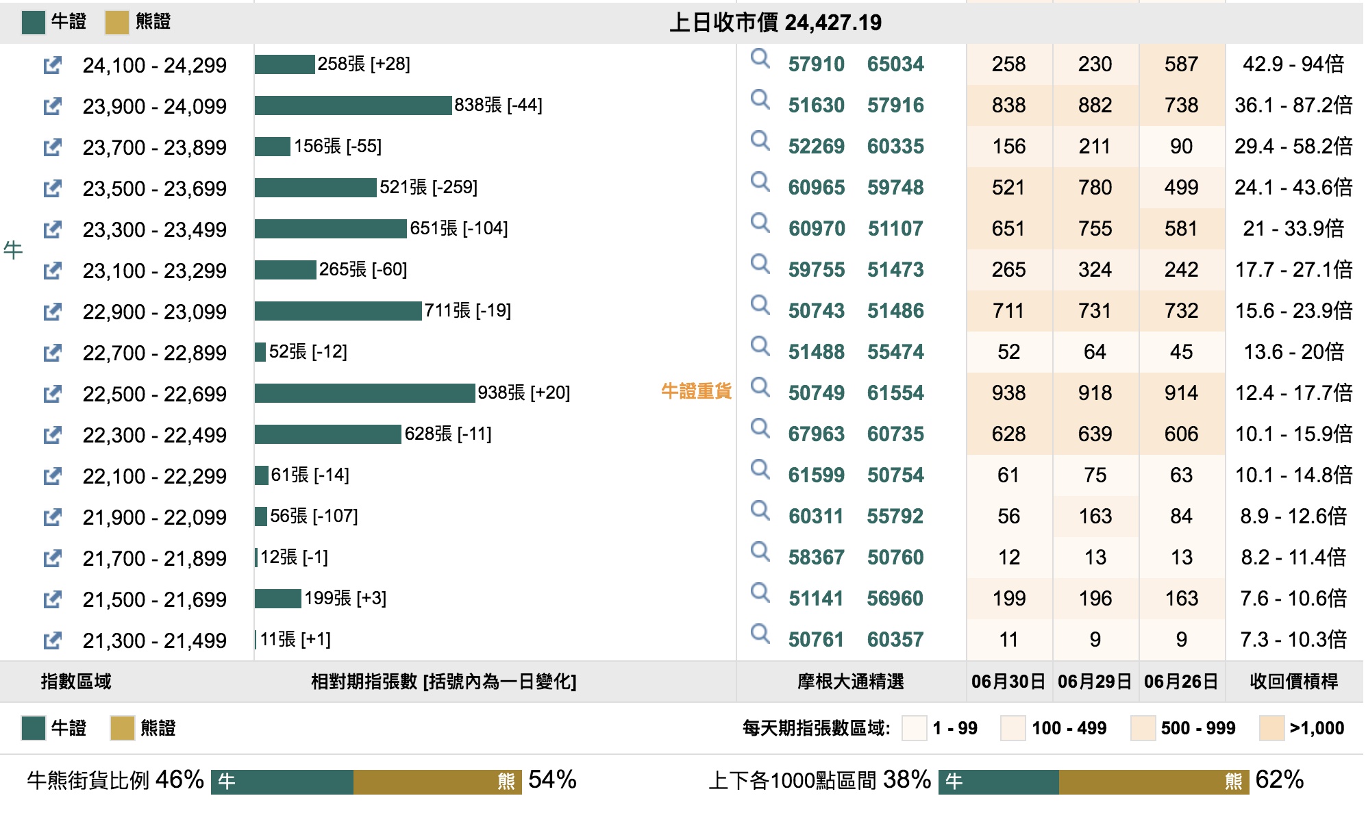 智通财经APP获悉,截至6月30日,恒指最新的牛熊街货比例46:54。摩根恒指牛熊证街货分布图中的数据显示,熊证街货重货区在25400-25599区间,该区间最新熊证数量为1099张,较上一交易日增加122张,最多新增区间在25000-25199,该区间最新熊证数量为798张,较上一交易日增加220张。牛证街货重货区在22500-22699区间,该区间最新牛证数量为938张,较上一交易日增加20张,最多新增区间在24100-24299区间,该区间最新牛证数量为258张,新增28张。