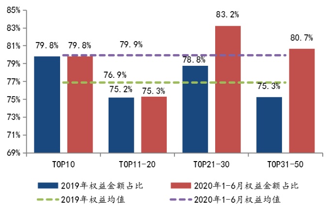 房企合作拿地权益金额占比上升。2020年上半年,50家代表房企拿地权益金额占比均值为79.9%,较2019年上升3个百分点。TOP10与TOP11-20阵营企业拿地权益占比较上年基本持平,TOP21-30、TOP31-50阵营企业权益金额占比均显著上升,远洋、中骏和华发涨幅均高于20个百分点;绿城、佳兆业和仁恒置地下降超过20个百分点。