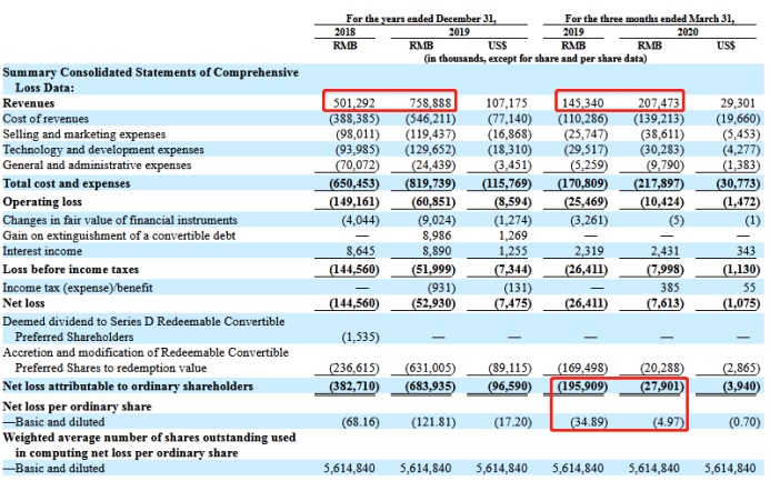 根据招股书中的财务报表,截至2019年12月31日,蓝城兄弟2019全年营收为7.59亿元(人民币,下同),同比增长51.4%。在截至2020年3月31日的一季度,公司营收达2.07亿元,同比增长42.8%。一季度归属于普通股股东的净亏损大幅收窄,同比收窄85.8%至2790万元;基本和摊薄后每股亏损也大幅收窄至4.97元。