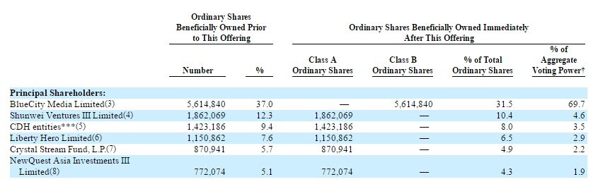 据招股书的股权披露,在本次IPO前,BlueCity Media Limited持有5,614,840股普通股。基于截至7月1日已流通的15,175,670股普通股计算(下同),该公司持股比例为37%,实益拥有人为蓝城兄弟创始人、董事长兼CEO马保力。在本次发售完成后,其所有普通股将被重新指定为B类普通股。