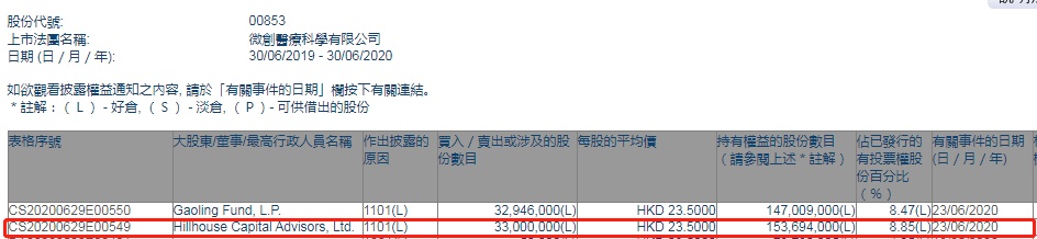 智通财经APP获悉,香港联交所最新资料显示,6月23日,Hillhouse Capital Advisors增持微创医疗(00853)3300万股,每股作价23.50港元,总金额为7.755亿港元。增持后最新持股数目约为1.54亿股,最新持股比例为8.85%。