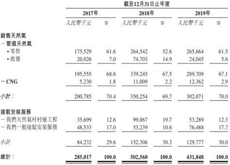 数据显示,公司2018年得益于新客户数量不断增加和经营地区内管道天然气使用量增加,使得2018年天然气的销售额大幅增加73.5%至3.39亿元人民币(单位下同),接驳安装服务营收也同比大幅增长80.8%至1.52亿元,公司2018年总营收达到5.03亿元,实现76.3%的同比增长。不过2019年公司天然气销售中的批发部分由2018年同期的7470.3万元,大幅下降67.8%至2404.5万元,导致天然气销售业务贡献营收同比下滑13.8%至3.02亿元,同时公司深州天然气村村通工程1号和武邑天然气村村通工程1号大部份工程已于先前年度竣工,因此接驳安装业务也同比下跌14.8%至1.3亿元,公司2019年总营收同比下滑14.1%至4.32亿元。
