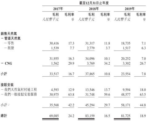 得益于接驳业务,公司2019年整体毛利率有所回升,但是毛利总额仍处于下滑态势。智通财经APP了解到,2017-2019的三个年度,由于平均管道天然气采购价增加以及供货商收取的平均管道天然气采购价的上涨,公司天然气销售业务的毛利率从2017年的16.7%跌至2018年的10.8%,2019年进一步下滑至7.8%。好在2019年公司高毛利率的一般接驳安装业务有所增长,带动公司接驳业务毛利率由2018年的29.7%回升至2019年的44.8%,使得公司2019年整体毛利率同比提升2.4个百分点至18.9%。不过最终并未覆盖营收降幅,2019年毛利总额同比下滑1.7%至8172.5万元。