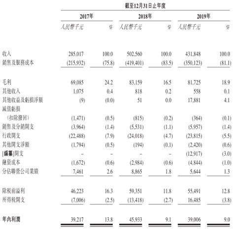不过费用率的全面上升,使得公司经营利润出现较大程度下滑。智通财经APP了解到,公司2019年销售及分销开支、行政开支、融资成本分别为595.7万元、2381.5万元、484.4万元,费用率分别为1.4%、5.5%、1.0%,较2018年同期分别上涨0.3、0.8、0.4个百分点,再加上所得税率有所提升,公司最终录得净利润为3900.6万元,同比大幅下滑15.1%,净利率由2018年同期的9.1%降至9%。并且,公司2019年如果刨除非经营项中其它收益达到了1788.1万元,记回1291.7万元的上市开支费用后,公司经营性净利润还要下降一个档次。