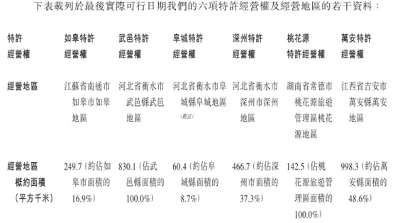 目前公司于阜城地区原占地面积为693.2平方千米,但是经协商双方就有关条款达成一致意见并于2018年10月28日签订阜城交还协议,且于2019年12月17日完成该协议。阜城交还协议完成后,公司该地去经营面积于2019年12月减少约91.3%至60.4平方千米,因此出现了前文提及经营面积大幅减少的情况。公司对此表示,并不能排除其他地区不会出现同样的状况,而且公司仅有6个特许经营权,每一次协商均会对公司经营面积造成较大程度的影响。