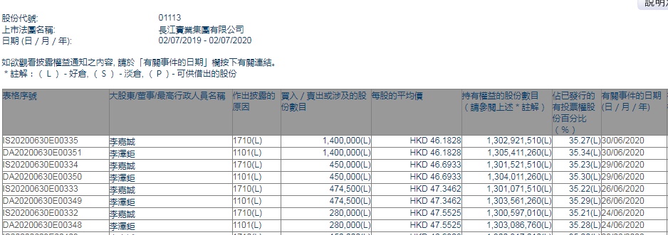 增持后,李嘉诚最新持股数目约13.03亿股,最新持股比例为35.27%,李泽钜最新持股数目约为13.05亿股,最新持股比例为35.34%。