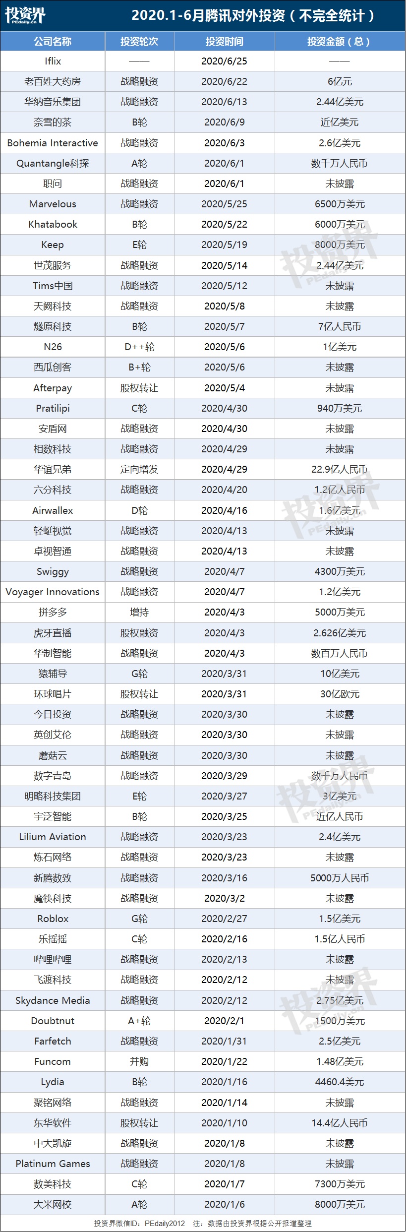 投资界不完全统计,2020上半年,腾讯共对外公开了近60家投资案例,平均每3天投资1家公司,堪称上半年最活跃的投资机构。