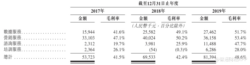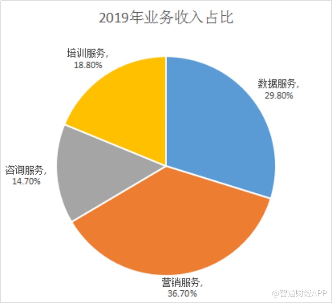 就此次递表的清科创业业务结构来看,主要包括数据、营销、咨询、培训四类业务。截至2019年,营销服务、数据服务为公司两大支柱业务,占收入比重分别为36.7%、29.8%。而从近三年收入结构变化来看,咨询、培训业务占收比也呈逐年上升趋势。