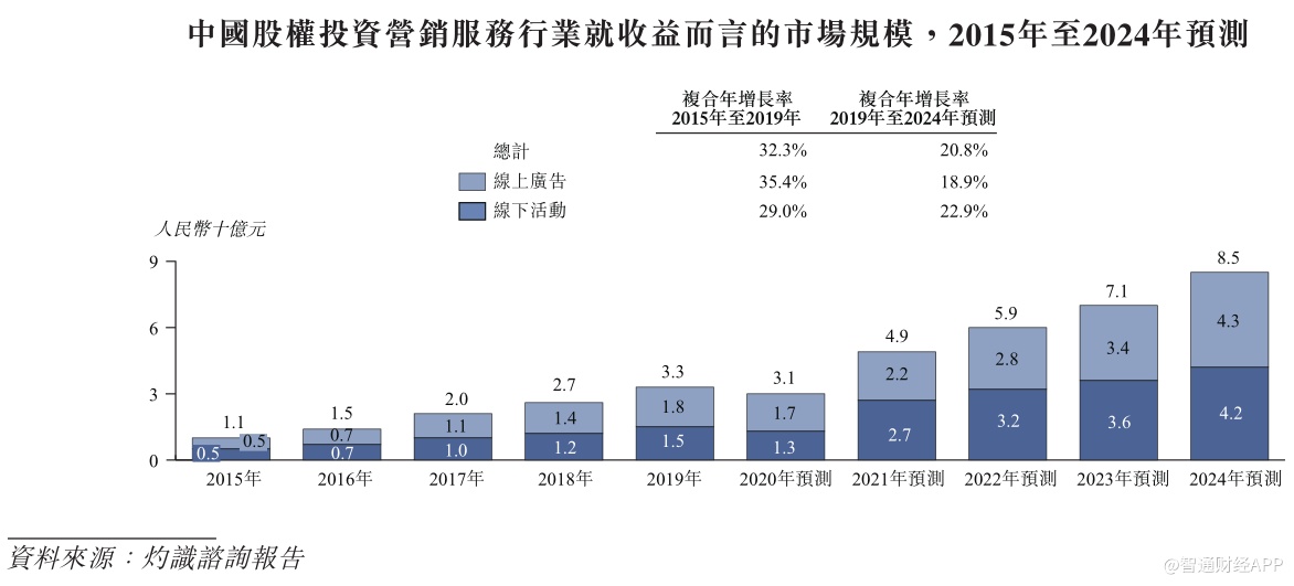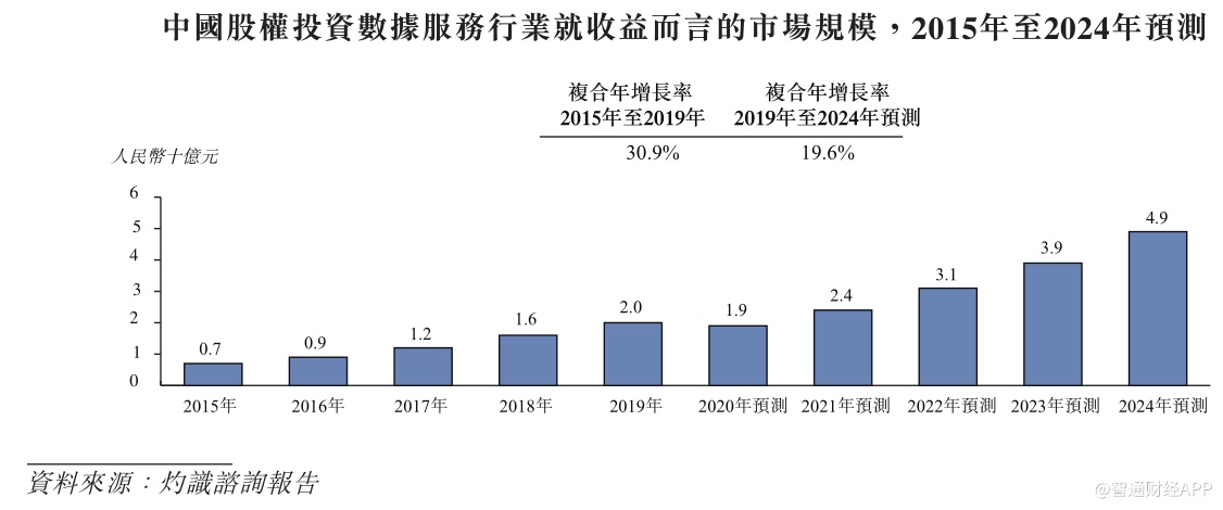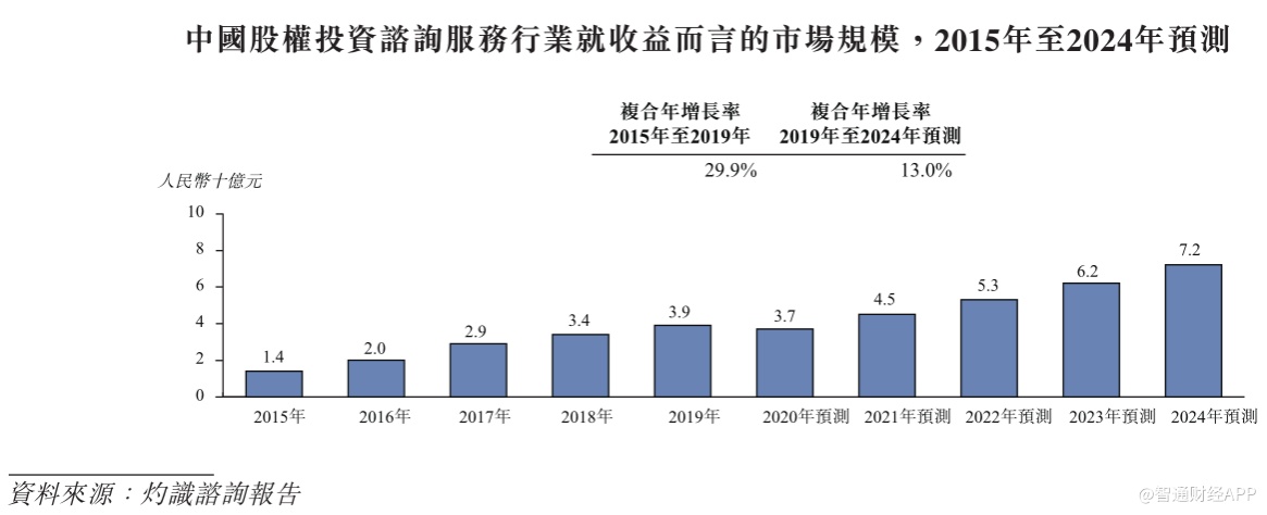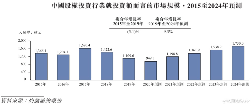 而据灼识咨询预计,受持续经济发展及转型、政策支持以及战略及机构投资人投资意愿的不断增长等因素的驱动,中国股权投资行业预期于2021年复苏,且市场规模预期将自2019年至2024年以9.3%的复合年增长率增长至2024年的人民币17300亿元。