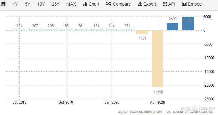 这些增长反映了美国正逐渐从3月和4月因公共卫生事件而引起的经济衰退中恢复,3月和4月合计就业人数减少了2220万。6月休闲和酒店业的就业人数急剧上升。除此之外,零售业、教育和卫生服务业、其他服务业、制造业、专业和商业服务行业的就业人数也有显著增长,但采矿业的就业人数持续下降。