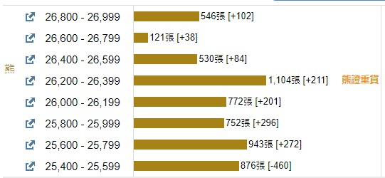 摩根恒指牛熊证街货分布图中的数据显示,熊证街货重货区在26200-26399区间,该区间最新熊证数量为1104张,较上一交易日增加211张,最多新增区间在25800-25999区间,该区间最新熊证数量为752张,新增296张。