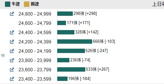 牛证街货重货区在24200-24399区间,该区间最新牛证数量为666张,较上一交易日减少103张,最多新增区间在24800-24999区间,该区间最新牛证数量为298张,新增298张。