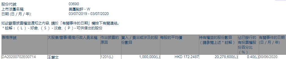 智通财经APP获悉,香港联交所最新资料显示,6月30日,联合创始人王慧文减持美团点评(03690)100万股,每股作价172.2487港元,总金额约为1.72亿港元。智通财经APP获悉,减持后最新持股数目为2027.86万股,最新持股比例为0.40%。