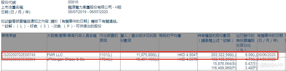 智通财经APP获悉,香港联交所最新资料显示,6月26日,FMR LLC增持龙源电力(00916)1107.5万股,每股作价4.5047港元,总金额约为4988.96万港元。增持后最新持股数目为2.03亿股,最新持股比例为6.09%。