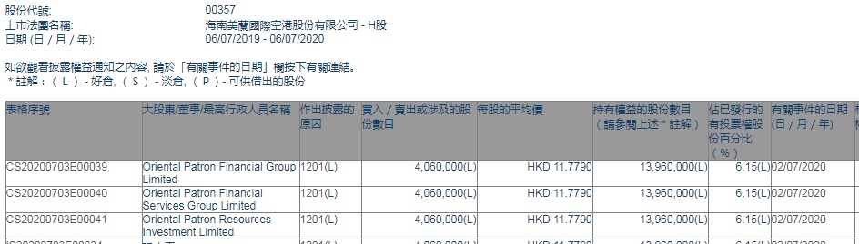 智通财经APP获悉,香港联交所最新资料显示,7月2日,Oriental Patron Financial Group减持美兰空港(00357)406万股,每股作价11.779港元,总金额约为4782.27万港元。智通财经APP获悉,减持后最新持股数目为1396万股,最新持股比例为6.15%。
