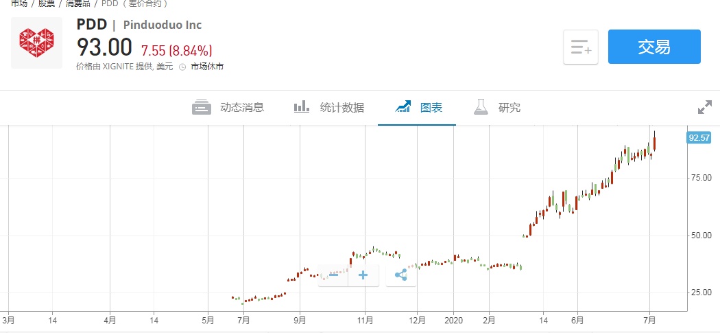 智通财经APP获悉,7月6日(周一)美股盘前,拼多多(PDD.US)股价站上100美元关口,创历史新高。截至16:30,该股涨7.56%,报100.03美元。