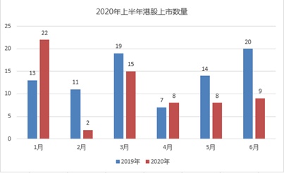 2020年上半年上市数量下滑明显,其中1月上市数量最多,2月几乎断档。智通财经APP了解到, 2020上半年共有64家企业在港上市,比去年同期的84家下降31.25%。其中首发上市59家,较去年同期的74家减少了15家,5家创业板转主板上市也较去年同期减少了3家。分月来看,2020年1月共计22家是上半年上市数量最多的一个月,随后公共卫生事件爆发的2月份骤减至2家,之后除4月份与去年同期持平外,其它月份仍较去年同期有较明显下滑。