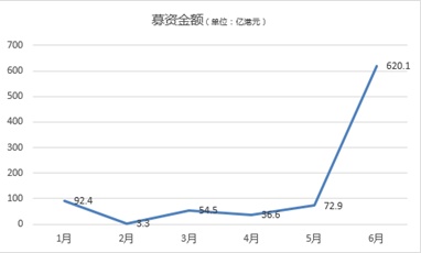 不过依赖6月份中概巨头回归,首发上市筹资总额还实现正增长。智通财经APP了解到, 2020年上半年总筹资额高达879.75亿港元,同比增长23%,其中40家来自内地,合计募资848.13亿港元,占全部募资额的96.9%。同样分月来看,一月至六月分别实现了92.4亿港元、3.3亿港元、54.5亿港元、36.6亿港元、72.9亿港元和620.1亿港元的募资金额。六月虽然只有8宗IPO,但因仅网易-S(09999)、京东集团-SW(09618)两家公司募资就高达542.6亿港元,占全部IPO募资的近62%,从而带动总筹资额大幅上行。同时,前十大IPO中8家都来自属于新经济的健康和科技、传媒与通信行业,筹资额占比高达94%。