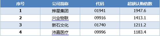 2020年上半年,港股共有4家超千倍认购标的。智通财经APP了解到,59家上市公司中,超额认购超过1000倍的有4家,其中01月16日上市的新石文化(01740)率先以1211.2倍超额认购出列,1.5%的一手中签率更是今年以来的最低。之后3月份上市的两只内地物业股烨星集团(01941)和兴业物联(09916)后来居上,分别创下1947.62倍、1413.06倍的超购倍数,最后5月份上市的沛嘉医疗-B(09996)以1183.4倍超额认购倍数拿下上半年的第四个名额。而且四名超购超千倍的大热门股票,无论是暗盘还是首日都实现了全线收涨。