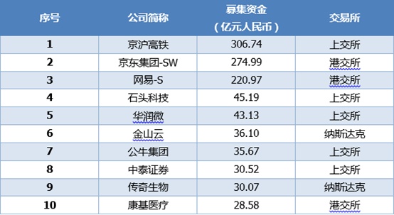 在中资企业募资规模TOP10中,前三名分别为京沪高铁、京东集团-SW、网易-S,之后石头科技45.19亿人民币的募资规模已经较前三名有巨大差距,而除了两大回归的中概巨头外,康基医疗(09997)同样以28.58亿元人民币的募资规模登上了TOP10榜单。