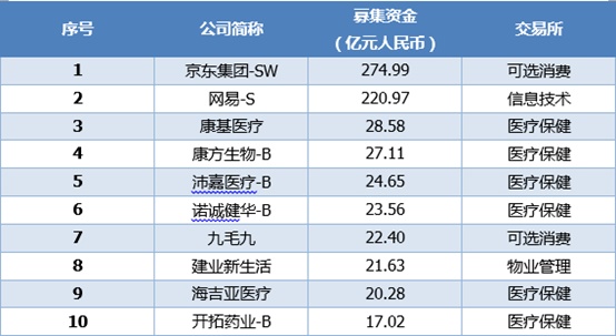 而港股市场募资排行TOP10中,6席被医疗保健占据。智通财经APP了解到,除京东、网易规模领跑外,之后基本是康基医疗、康方生物-B、沛嘉医疗-B和诺诚健华-B等医疗企业募资规模较靠前,募资规模均在20亿元以上,仅剩消费类的九毛九(09922)和物业管理板块的建业新生活(09983),分别以22.4亿元人民币和21.63亿元人民币分占第七和第八位。