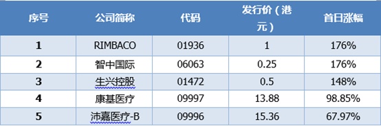 首日破发比率下调,首日涨幅小市值股票包揽前三。智通财经APP了解到,从首日上市的涨跌幅数据来看, 64只新股收得35正3平26负,破发率约为41%,较去年上半年45%的首挂破发率下降4个百分点。主板首日涨幅前五中,RIMBACO、智中国际并列首位,前3名涨幅为总市值5亿港元及以下的小盘股。之后康基医疗、沛嘉医疗-分列第四、五位。26只下跌的新股中,马来西亚第二大光学产品零售商MOG HOLDINGS股价直接腰斩,名列跌幅榜首,排在第二的蚬壳电业收跌-43.60%,亏损10%-50%达18只,长虹佳华、稀美资源、光荣控股等7只,跌幅在10%以内。