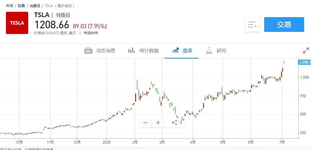 智通财经APP获悉,7月6日(周一)美股盘前,特斯拉(TSLA.US)股价继续上涨,截至16:59,特斯拉盘前涨5.49%,报1275美元。