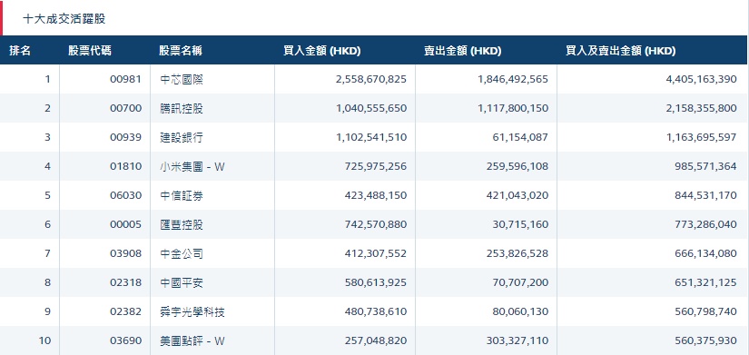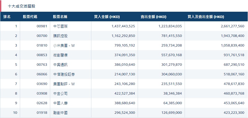 此外,建设银行(00939)、汇丰控股(00005)、中兴通讯(00763)分别获净买入10.41亿、7.11亿、8473万港元。而微创医疗(00853)遭净卖出1.83亿港元。