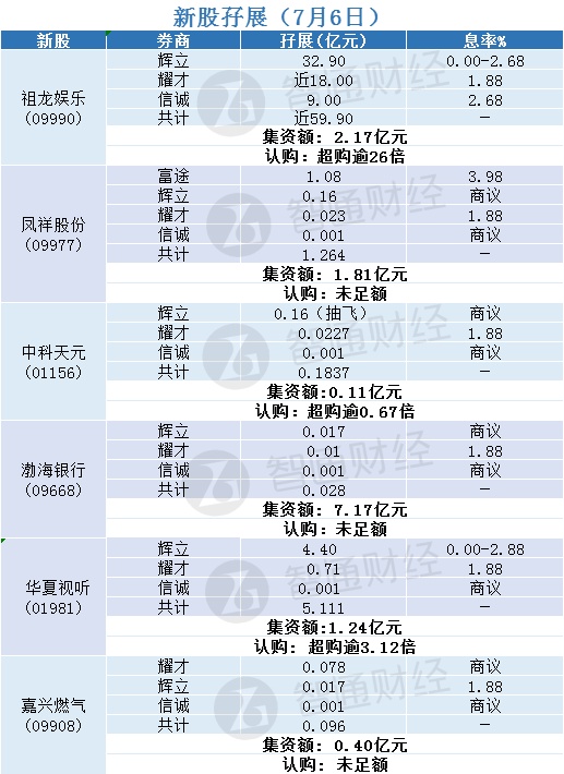 智通财经APP获悉,祖龙娱乐(09990)、凤祥股份(09977)、中科天元(01156)、渤海银行(09668)、华夏视听(01987)、嘉兴燃气(09908)正在招股中,截至7月6日,辉立 、耀才、信诚等券商合计分别为其借出近59.90亿港元、1.264亿港元、0.1837亿港元、0.028亿港元、5.111亿港元、0.096亿港元。其中,祖龙娱乐超购逾26倍、中科天元超购逾0.67倍、华夏视听超购逾3.12倍。