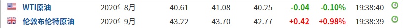 截至发稿,WTI原油跌0.1%,报40.61美元/桶。布伦特原油涨0.98%,报43.22美元/桶。