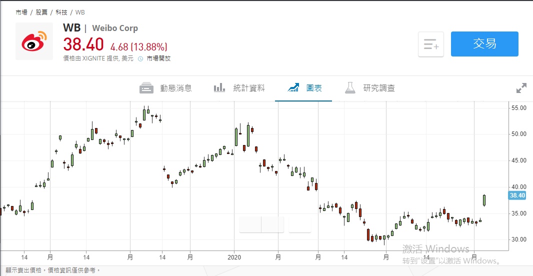 智通财经APP获悉,7月6日(周一),微博(WB.US)涨14.15%,截至21:55,报38.48美元。