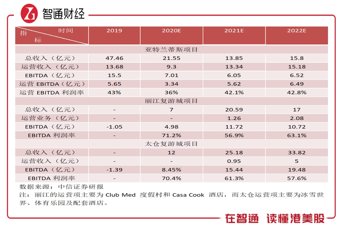 智通财经根据中信证券于4月底发布的研报整理,2020年受卫生事件影响,亚特兰蒂斯项目运营收入有所下降,但之后恢复增长,EBITDA利润率将保持在42%的水平,而丽江太仓项目预计较为保守,配套物业部分主要在2021年对业绩产生较大贡献,而运营部分推延至2022年。