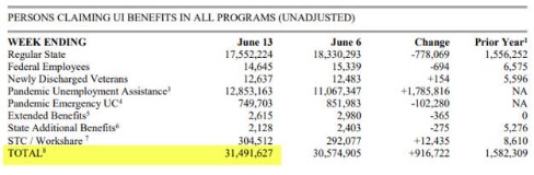 截至2020年6月13日的一周内,约有3149万劳动者申请了各类失业保险。值得注意的是,归属于卫生事件失业援助类别下的人数每周从1107万人增加到1285万人。
