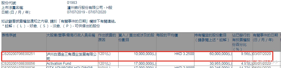 智通财经APP获悉,香港联交所最新资料显示,7月3日,泸州白酒金三角酒业发展有限公司减持泸州银行(01983)1000万股,每股作价3.25港元,总金额为3250万港元。智通财经APP获悉,减持后最新持股数目为6000万股,最新持股比例为9.56%。