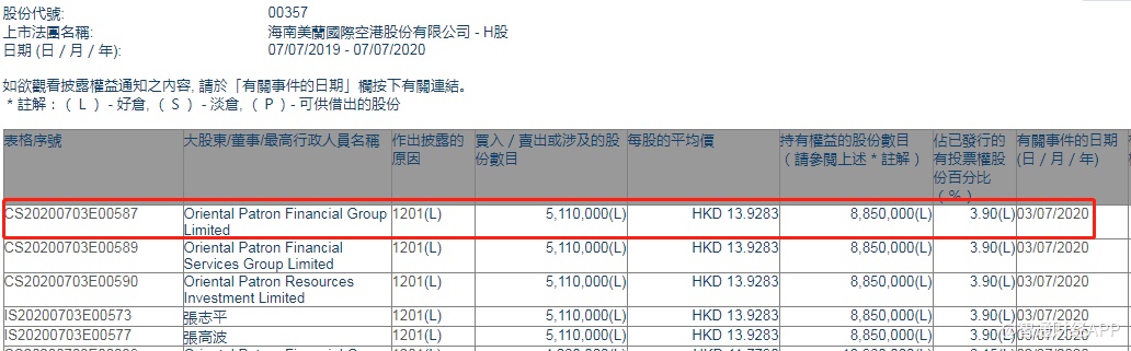 智通财经APP获悉,香港联交所最新资料显示,7月3日,Oriental Patron Financial