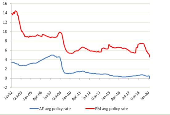 虽然量化宽松和相关的货币供应扩张在发达经济体已经是常态化操作,但新兴市场经济体也开始发行新债券,并让它们的央行在市场上购买这些债券来避免公共卫生事件所引发的金融危机。全球范围内越来越多的经济体开始降息,并将目光投向零利率边界的底部。下表显示了发达经济体与新兴经济体的利率水平,这表明了利率下降的结构性趋势。此外,与2008/09年大萧条相比,2020年公共卫生事件危机所导致的利率下降更低。